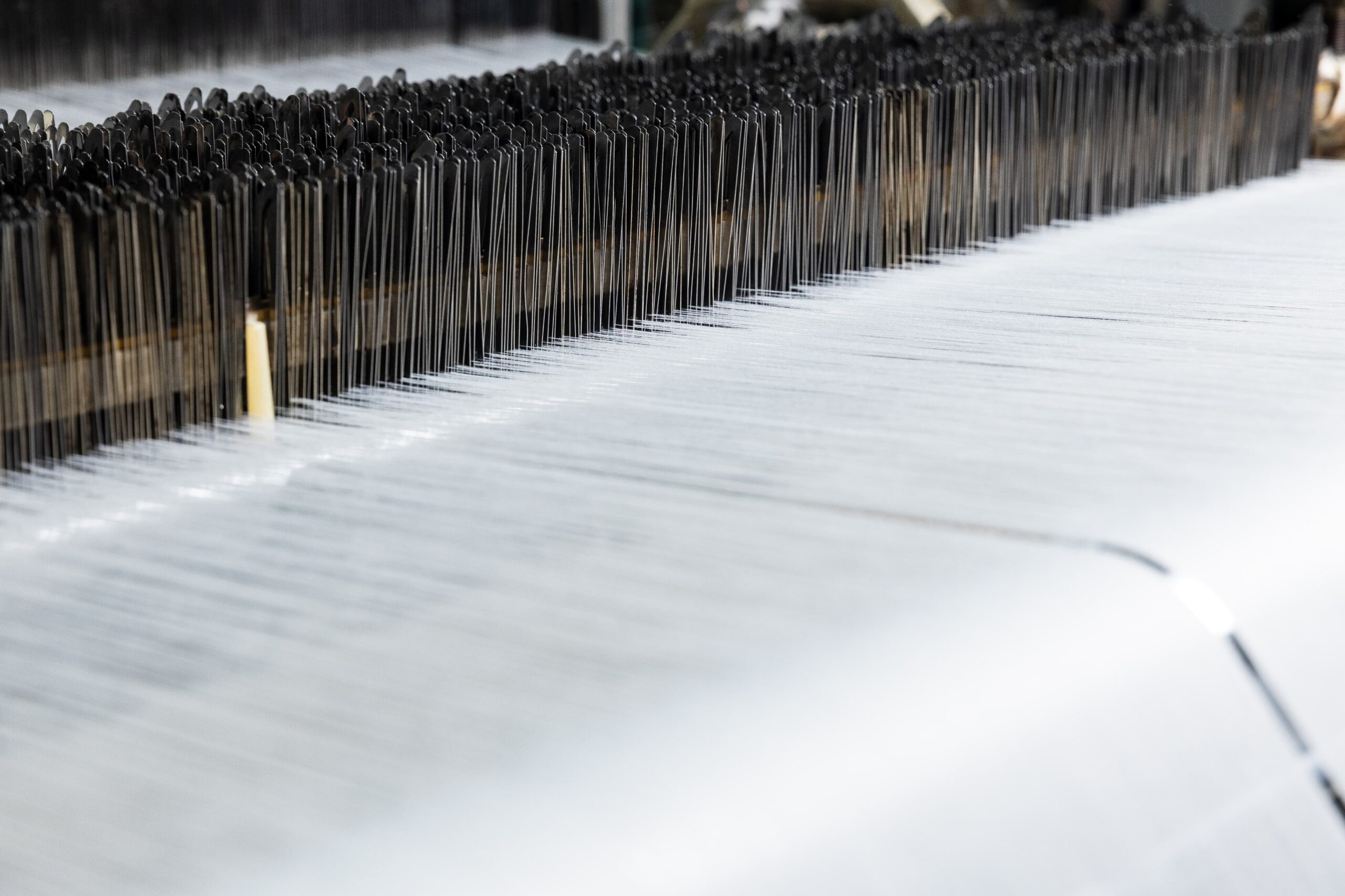 Interlacing two sets of yarns (warp and weft) to create fabric.
